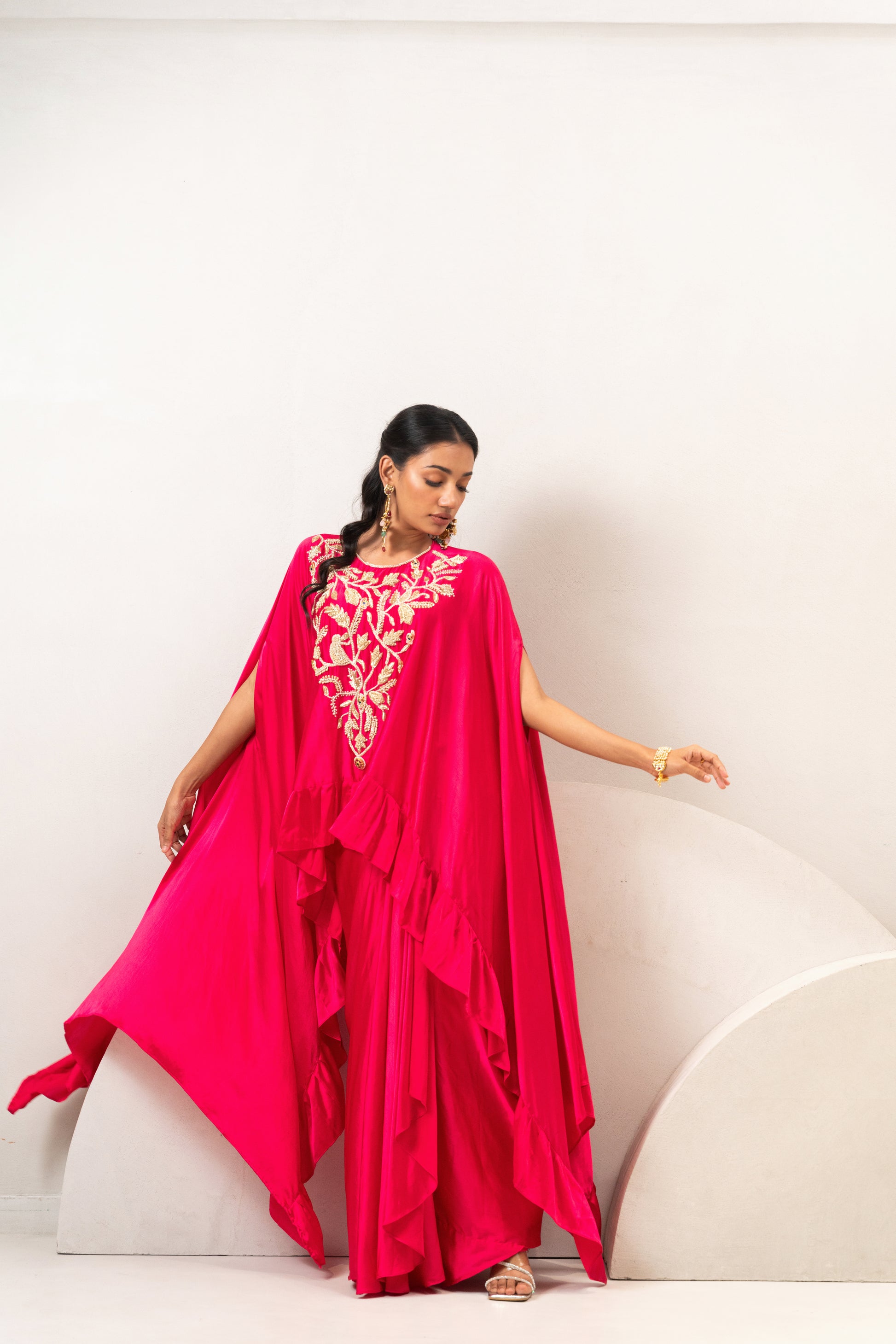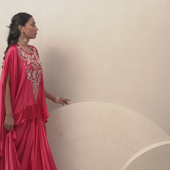 This exquisite modal set is crafted with intricate Kundan, Zardosi, Katdana, and Moti work. Each embellishment is meticulously applied by skilled artisans for a luxurious, unique finish. The rich fabric and delicate handwork make it perfect for any special occasion.