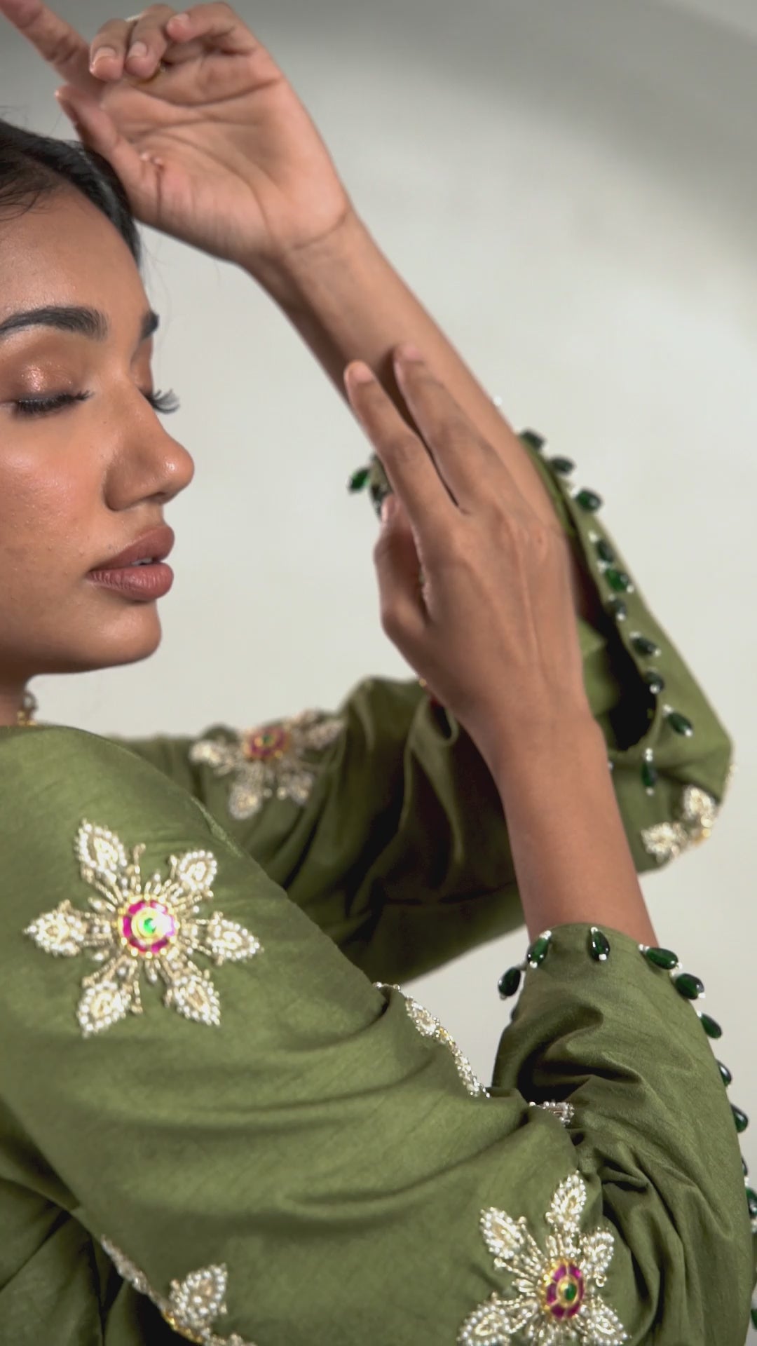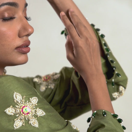 This exquisite modal set is crafted with intricate Kundan, Zardosi, Katdana, and Moti work. Each embellishment is meticulously applied by skilled artisans for a luxurious, unique finish. The rich fabric and delicate handwork make it perfect for any special occasion.